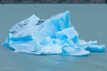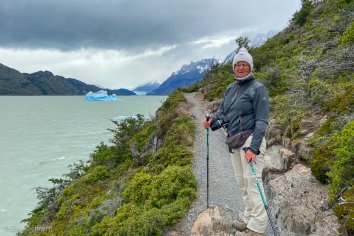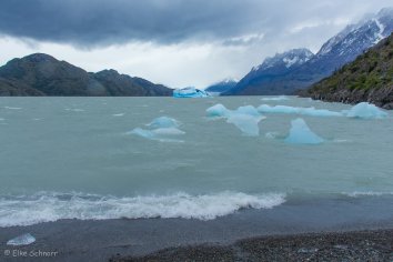 Nachdem diese Hürde einmal genommen ist, ist die Wanderung aber eigentlich ganz nett: sie führt zum südlichen Ufer des Lago Grey mit einem breiten Kiesstrand. Im Wasser schwimmen jede Menge tiefblaue Eisbrocken — teilweise zum Greifen nah — und am Ende des Strandes kann man noch auf einer kleinen baumbestandenen Halbinsel zu einem Aussichtspunkt laufen.