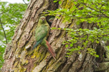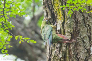 Aber zumindest können wir während dem Warten ein paar Smaragdsittiche in den Bäumen beobachten, unter anderem ein Weibchen, das gerade sein Baby in einem Astloch füttert.