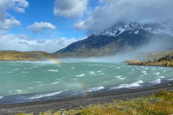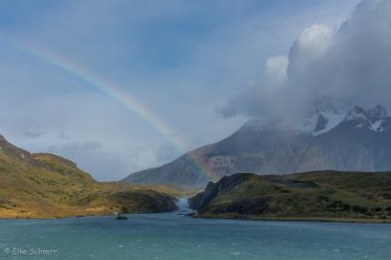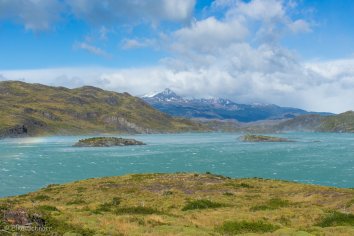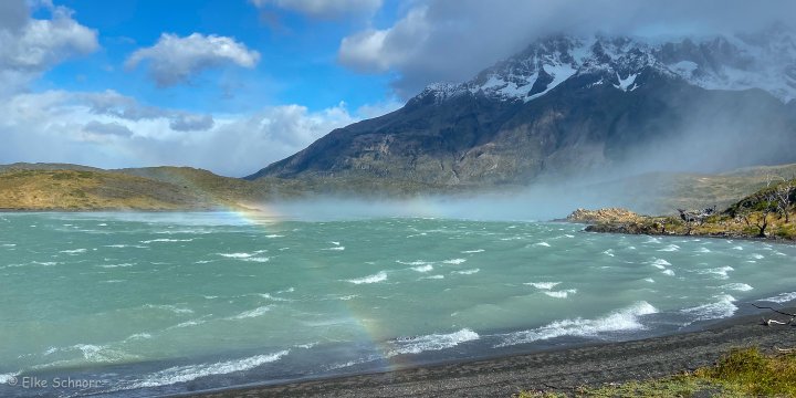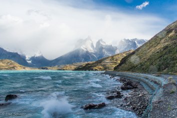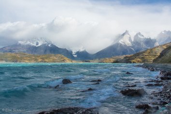 Es ist zwar nach wie vor total stürmisch und der Wind peitscht die Wellen nur so über den Lago Pehoe, aber er fängt auch an, die dicken Wolken wegzublasen und die Sonne kommt mit einem Mal heraus.