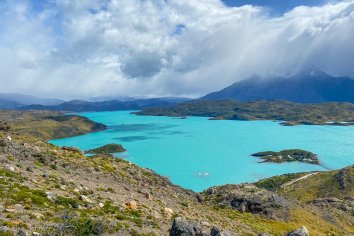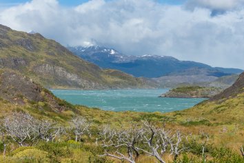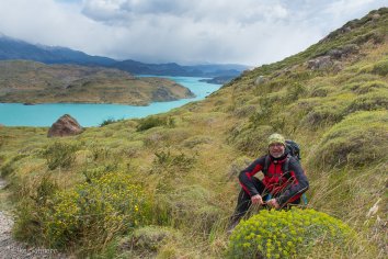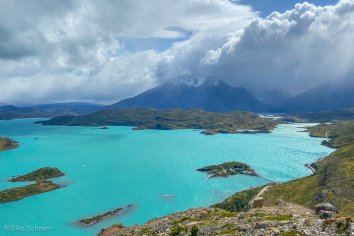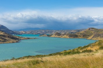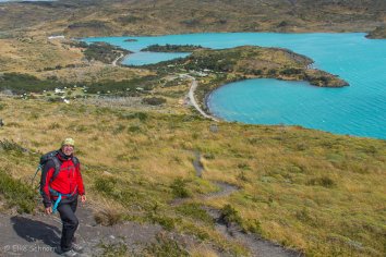 Der Weg zum Aussichtspunkt führt sanft ansteigend durch eine idyllische Hügellandschaft und ist sehr angenehm zu laufen. Nach einer Dreiviertelstunde sind wir bereits oben und genießen eine Weile die geniale Rundumsicht auf den Lago Pehoe, auf das Bergmassiv und die unberührten Hügel und Lagunen auf der Gegenseite.
