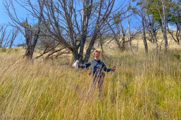 Der Weg hinab auf der anderen Seite führt zum großen Teil durch hohes Gras und gefällt uns auch total gut. Allerdings sind auch hier die Spuren des schlimmen Waldbrandes noch allgegenwärtig.