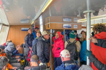Während dem Warten wird es ziemlich kalt. Wir ziehen uns alles über was wir dabei haben, zittern vor uns hin und sind froh, als wir endlich auf den Kahn dürfen.