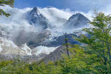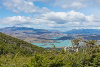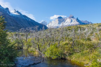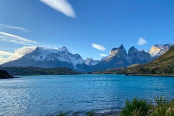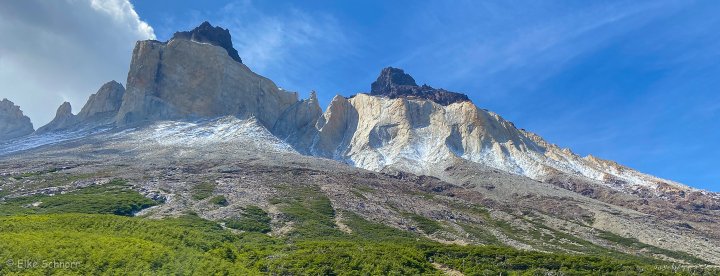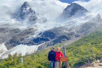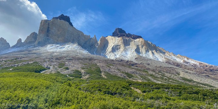 Gegen 13:30 Uhr erreichen wir den Aussichtspunkt Mirador Francés am Fuß der „Hörner“ Los Cuernos. Hier bietet sich uns ein grandioser Ausblick auf den Französischen Gletscher, der sich von dem Berg Paine Grande abwärts bewegt. Im Hintergrund tafeln sich die Spitzen der Cuernos auf und unten im Tal spiegeln sich die Seen.