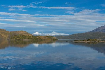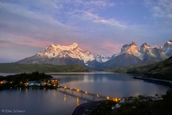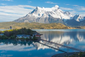 Als wir mit unseren Koffern über die Brücke laufen, ist auf dem Lago Pehoe nicht die kleinste Welle zu sehen.