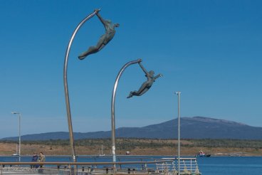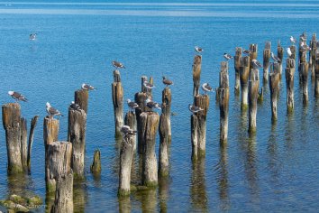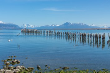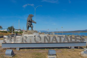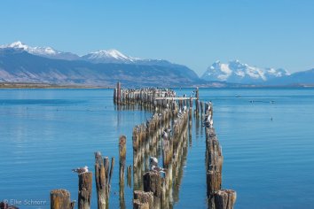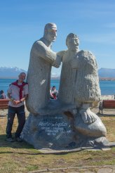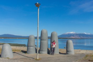 Nach 2.5 Stunden Fahrt mit vielen kurzen Halts kommen wir in Puerto Natales an. Hier machen wir Zwischenstopp und spazieren eine Runde an der Uferpromenade entlang, wo es ein paar nette Fotomotive gibt. Zum Beispiel den Steg am alten Pier, viele Wasservögel und diverse Figuren am Strand: