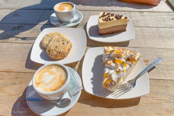 Im Coffee Maker lacht uns dann die Auslage mit den Kuchen und Torten so an, dass wir nicht widerstehen können und zwei Stück nebst Cappuccino bestellen.