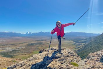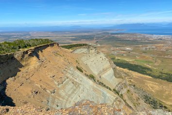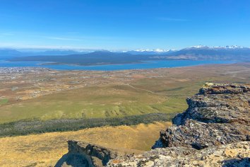 Oben wird man schließlich nach dem kräftezehrenden Anstieg mit einem tollen Panoramablick über Puerto Natales, den Fjord und die dahinterliegenden Gipfel der patagonischen Anden belohnt.