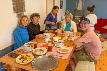 Den Österreichern geht es ganz genauso und so sitzen wir auch heute Morgen wieder mit ihnen zusammen am Tisch und plaudern bei selbst gebackenen Brötchen, leckeren Pancakes, Erdbeersaft und viel frischem Obst .