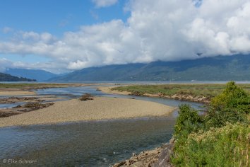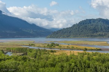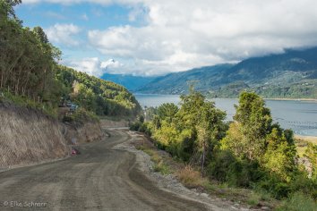 Auf teils engen und kurvenreichen Pisten geht es entlang des eindrucksvollen Reloncaví-Fjords durch eine herrliche Berglandschaft, bis wir bei Puelche an die offene Meeresküste stoßen. Dichtes Grün säumt die Straßen und es gibt immer wieder schöne Aussichtsblicke.