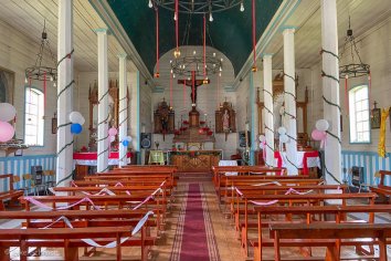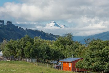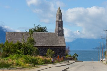 In Cochamó legen wir einen kurzen Stopp ein — ein noch recht ursprünglicher Ort mit einer hübschen Kirche und schönem Blick auf die gerade freiliegende, schneebedeckte Spitze des Vulkan Yates.