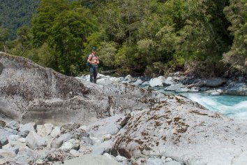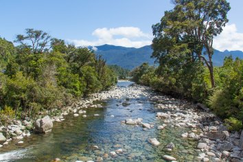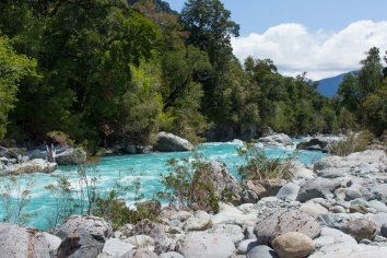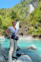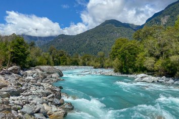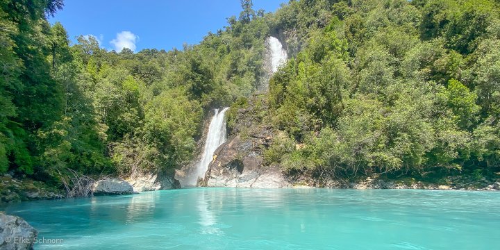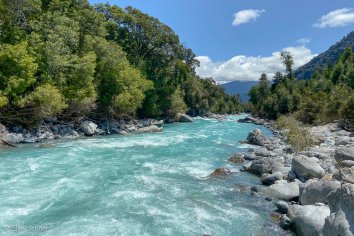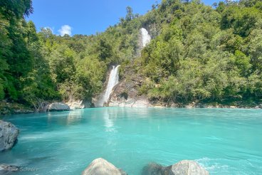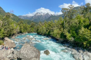 Der Weg ist recht abwechslungsreich und gefällt uns richtig gut: er verläuft zum Großteil im Nationalpark Hornopirén und führt immer am Rio Blanco mit seinem wundervoll türkisfarbenen Wasser entlang, dabei teilweise durch den Regenwald, dann wieder durch blühende Wiesen mit Blick auf die schneebedeckten Bergspitzen.