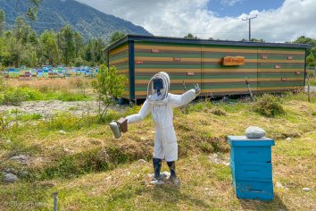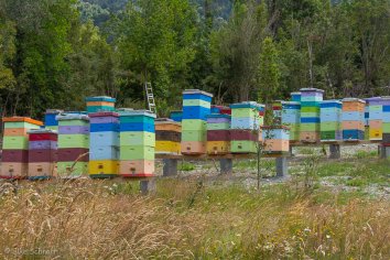Auf der weiteren Fahrt sehen wir immer wieder bunte Bienenstöcke und an vielen Straßenständen wird Honig verkauft. An einem davon halten wir, probieren alle Sorten durch und nehmen ein großes Glas mit. Da wir ja diesmal einige Unterkünfte ohne Frühstück gebucht haben, sollte es kein Problem sein, den in den nächsten Wochen aufzuessen.