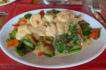 Was dann kommt, ist tatsächlich eine kleine Überraschung: Zwei nahezu identische Teller mit je einem Riesenberg Gemüse und Shrimps — nur, dass unter dem einen Berg ein Steak versteckt ist und unter dem anderen ein Stück Lachs