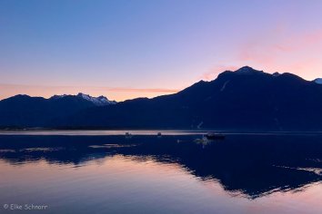 Es wird schnell hell und schon bald strahlt die Sonne vom wolkenlosen Himmel auf eine tolle Landschaft: im Sommer vom Meer aus schneebedeckte Berge zu sehen, ist eine Premiere für uns.