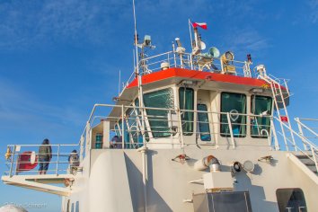 Als uns auf der Hälfte der Strecke die zweite Fähre entgegen kommt, lässt der Kapitän zur Begrüßung das Nebelhorn laut aufdröhnen. Wir sitzen dummerweise gerade direkt darunter und bekommen einen mörderischen Schreck.