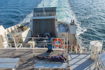 Um 6:00 Uhr sind wir durch und fahren runter zum Hafen, wo wir uns in die Autoschlange für die Fähre einreihen. Es hieß bei der Buchung, dass man sich trotz Reservierung eine Stunde vor Abfahrt an der Mole einfinden soll. Andreas unkt zwar zuerst, dass das viel zu früh wäre und wir jetzt sicher ewig hier herumstehen würden, aber dann geht es doch schon nach ein paar Minuten mit dem Beladen der Fähre los und 20 Minuten später sind wir bereits an Bord.