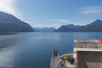 Wir hatten eigentlich die Variante mit der Doppelfähre gebucht, bei der man das kurze Zwischenstück von Leptepú nach Fiordo Largo mit dem Auto überbrücken muss. Diese Variante wäre landschaftlich sicher die noch schönere — schade.