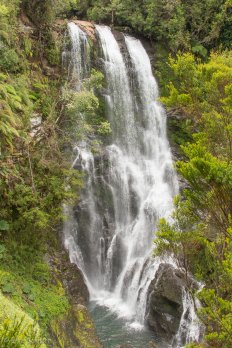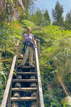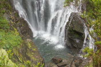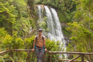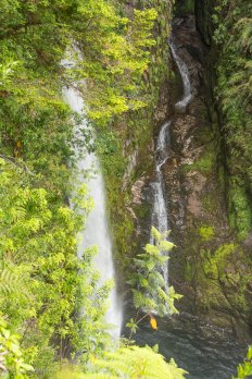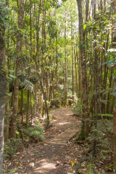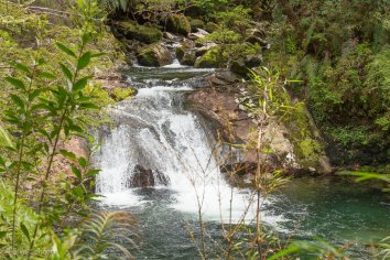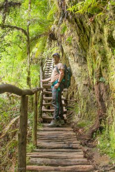 Dieser ist mit knapp fünf Kilometern deutlich länger und auch ein bisschen anstrengender: Entlang eines kleinen Gebirgsbaches geht es stetig steil bergauf durch den Regenwald. Ab und zu überqueren wir mit Hilfe kleiner Holzbrücken den Bach und kommen an zahlreichen kleineren Kaskaden und Wasserfällen vorbei.