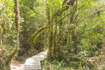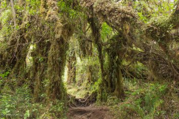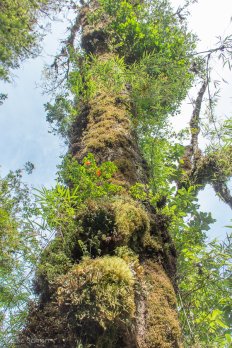 Auf Holzplanken laufen wir durch den Alercenwald mit seinen uralten patagonischen Lärchen. Riesige Farne und von Bäumen herunterhängendes Moos versprühen einen Hauch von Mittelerde