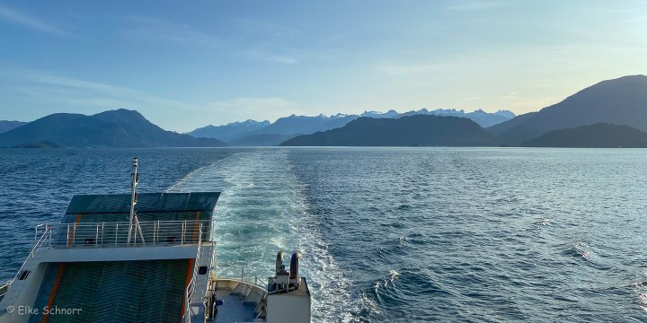 Pünktlich um 7:00 Uhr geht es dann los. Wir holen uns zwei Kaffee zum aufwärmen und zum munter werden und gehen an’s Oberdeck, um uns an der Fahrt durch die Fjordlandschaft zu erfreuen.