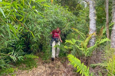 Der Weg führt durch einen Bambuswald und ist leider nicht besonders gut in Schuss. Der Bambus wuchert von beiden Seiten weit in den Weg hinein und wir müssen immer wieder den teilweise recht spitzen Stangen ausweichen.