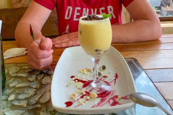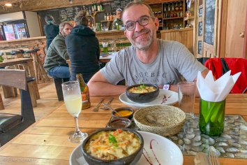 Aber obwohl wir es quasi nur aus der Not heraus gewählt haben, gefällt es uns dann total gut. Eine gemütliche Atmosphäre, dezente Musik und das Essen — chilenische Hausmannskost — ist echt lecker. Wir nehmen beide Chupe de mariscos — eine Art Auflauf mit Meeresfrüchten — und teilen uns hinterher noch einen Nachtisch. Getränkemäßig habe ich Geschmack am Pisco Sour gefunden, Andreas bleibt jedoch beim Bier.