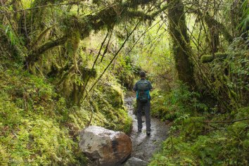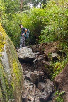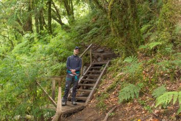 Rundherum ist vom Regen der letzten Nacht alles recht nass, es tropft leicht von den Bäumen und umgestürzte und mit Moos bewachsene Bäume liegen quer über dem Weg — eine richtige Märchenwald-Stimmung.
