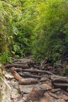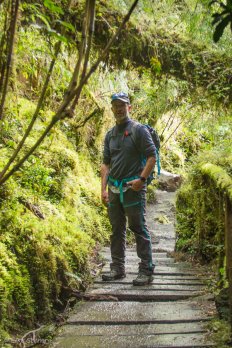 Dann geht es durch dichten Regenwald in vielen Serpentinen — anfangs recht steil — nach oben.