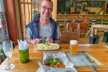 Für mich gibt es heute Papillote Meruha — irgendwas mit Fisch und Kartoffeln in Alufolie — und Andreas nimmt ein vegetarisches Gericht, das am Nachbartisch recht lecker aussieht.