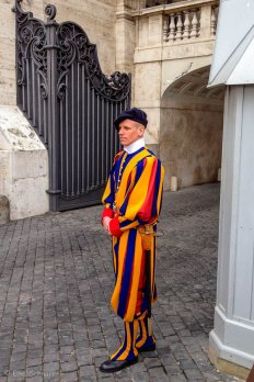 Auf dem Petersplatz ist unsere Führung dann offiziell beendet. Wir schauen noch ein wenig bei den Vorbereitungen für das morgige Urbi et Orbi zu und machen das obligatorische Foto von der Schweizergarde. Die Soldaten aus dem Alpenstaat sind seit 500 Jahren die Wächter des Papstes und des Vatikans. Ihre Uniformen mit der blau-gelb gestreiften Kniehose sollen angeblich von Michelangelo entworfen worden sein.