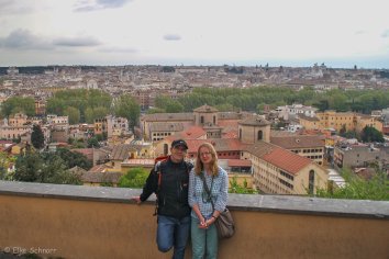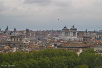 Wir bleiben auf der westlichen Seite des Tiber und wandern über die Via Garibaldi den Hügel zum Monte Gianicolo hinauf. Von hier oben hat man einen tollen Blick über die Stadt und wir verschnaufen ein wenig bei dieser Aussicht — abseits der Hektik und des Verkehrs im Zentrum.