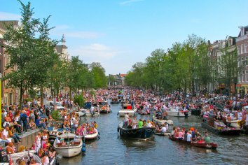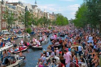 Später geht es dann weiter nach Amsterdam, wo wir gegen 17:00 Uhr im Marriot einchecken. Während wir uns anfangs noch über den Mangel an Parkplätzen wundern — nicht mal im Hotelparkhaus ist etwas frei — und über die vielen etwas seltsamen Gestalten, wird uns die Ursache bald klar: In Amsterdam findet ausgerechnet heute die jährliche „Gey-Parade“ statt und in den Straßen und Kanälen herrscht quasi Ausnahmezustand.