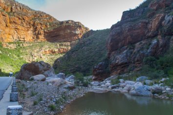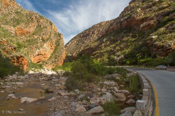 Für den Rückweg nach Oudtshoorn fahren wir nun die alternative Strecke durch die Meiringspoort — eine Schlucht, die vor allem durch die bizarr geformten Sandsteinformationen und die roten Klippen bekannt ist.