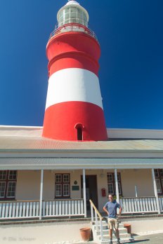 Am Leuchtturm von Cape Agulhas halten wir noch einmal an, da dieser gestern ja schon geschlossen war. Über sehr steile Holzleitern klettern wir 70 Stufen nach oben und müssen dort wegen des starken Windes unsere Brillen gut festhalten.