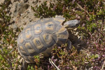 Wir setzen unsere Tour in Richtung Westen fort und nachdem wir Struis Bay passiert haben, heißt es erst mal wieder 90 Minuten lang auf einer Gravel Road Staub schlucken, Schildkröten beim Straße überqueren helfen und Schlaglöchern und Schlangen ausweichen, wobei sich Andreas als echter „snake spotter“ erweist.