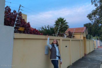 Hier sieht es sehr nett aus mit hübschen Häusern und viel Grün, aber was uns auch sofort auffällt, sind die Elektrozäune, die überall für Sicherheit sorgen. Irgendwie leicht irritierend.