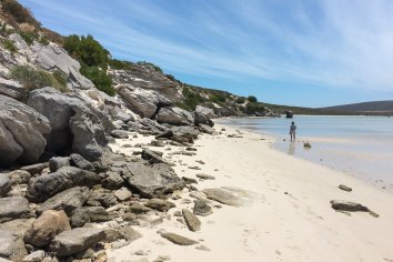 Schließlich waten wir bei Kraalbaai noch im lauwarmen türkisfarbenen Wasser der Lagune herum. Das Wasser ist glasklar — Ursache dafür sind wohl Muschelkolonien, deren Bewohner das Wasser filtern und die mikroskopisch kleinen Partikel zurückhalten.