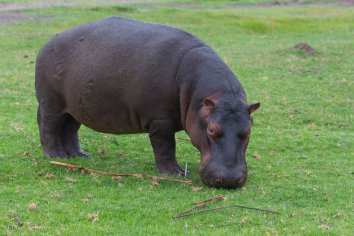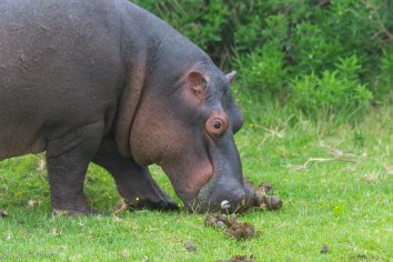 Am Rande eines Wasserlochs entdecken wir einen kleinen Hippo, der genüsslich schmatzend im Gras herumwatschelt.
