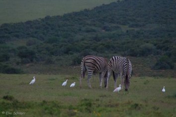 Zu guter letzt sehen wir noch ein paar Zebras und Wasserbüffel in perfekter Symbiose mit Kuhreihern — das gibt ein schönes Bild ab, auch wenn es mittlerweile leider viel zu dunkel zum Fotografieren ist.