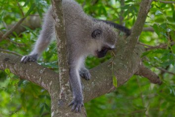 So dreht Andreas um 6:30 Uhr erstmal seine Jogging-Runde und ich beobachte die frechen Meerkatzen, die in den Bäumen um unser Rondawel herumspringen und alles Essbare stibitzen, was sie in die Finger bekommen können.