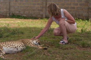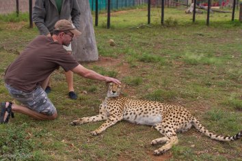 In ein Gehege mit zwei Geparden gehen wir mit dem Guide nach entsprechenden Sicherheitsbelehrungen hinein und können einen der Cheetahs sogar streicheln — ein echt aufregendes Gefühl.