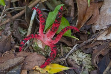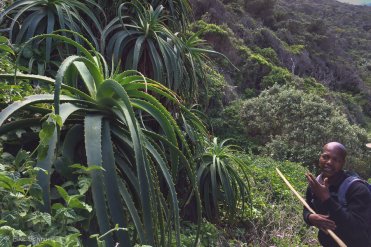 Jetzt verlassen wir die Küste und es geht wieder recht steil hinauf durch den Wald, wobei wir unterwegs viele unbekannte Pflanzen sehen, die unsere Guides uns erklären — z.B. Stinkmorcheln in Form von Seesternen, „knubbelige Bäume“, sowie Aloe und wilde Feigen.