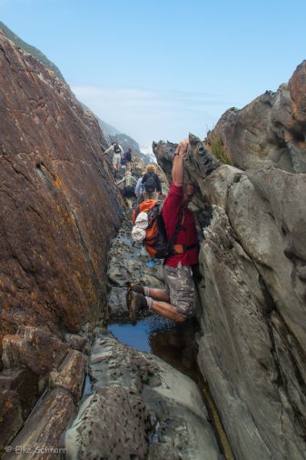 Auf Sea Level angekommen, geht der Weg jetzt mit vielen Klettereinlagen eine ganze Weile über die Felsen. Dabei stürmt es ordentlich und die Wellen sind entsprechend gigantisch.