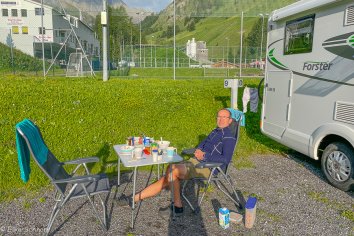 Die restlichen Wolken von gestern haben sich alle verzogen und so können wir mit tollem Bergpanorama-Blick frühstücken.