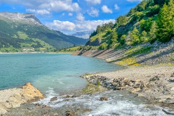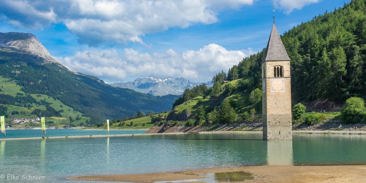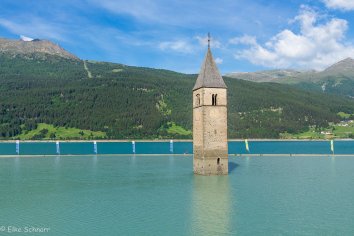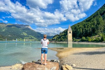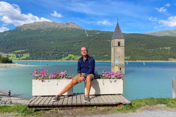Am herrlich türkisblauen Reschensee halten wir beim berühmten versunkenen Kirchturm Alt-Graun, der als Wahrzeichen der Region rund um das Vinschgau Tal gilt.