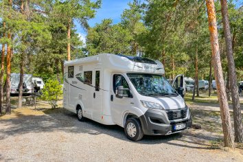 Wir laufen eine Runde durch das Areal und begutachten die freien Stellplätze. Die 127 ist perfekt: geräumig, schattig, passt — den nehmen wir
