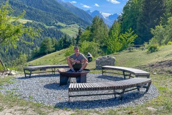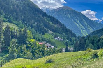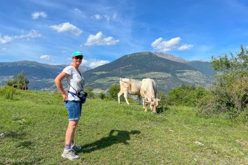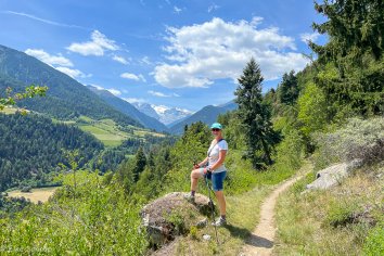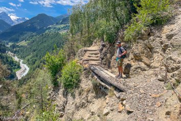 Unsere heutige Wanderung führt über den Agumser Bergwaal zur Stilfser Brücke und weiter zum Bergdorf Stilfs. Es ist sehr warm und sonnig und geht insbesondere am Anfang steil nach oben, so dass wir gut ins Schwitzen geraten.