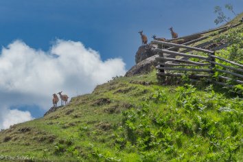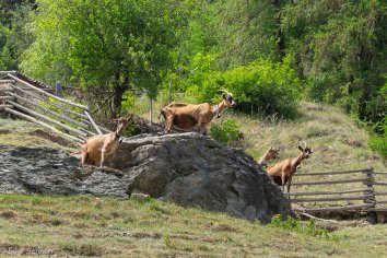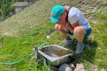 Unterwegs treffen wir ein paar lustige Ziegen und nutzen ihre Tränke für eine willkommene Abkühlung.