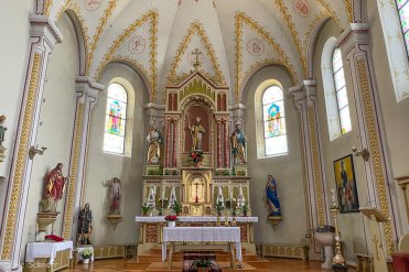 Gegen 14:15 Uhr kommen wir nach 2.5 Stunden im Bergdorf Stilfs an. Die Küche im einzigen Gasthaus hat leider schon geschlossen, aber wir bekommen zumindest noch einen Apfelstrudel und schauen uns anschließend die kleine hübsche Kirche an.