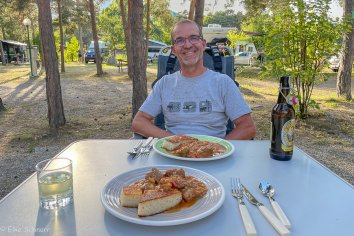 Gegen 17:45 Uhr sind wir wieder zurück am Campingplatz und Andreas geht eine Runde im benachbarten Freibad schwimmen. Das ist echt geschickt, denn es gibt einen direkten Zugang vom Campingplatz aus. Anschließend wird gekocht — heute mit „Unterstützung“ der Vector-Kantine: es gibt indisches Lamm mit Idli und zum Nachtisch Käsekuchen aus dem Glas.